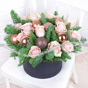 Снежные хлопья - коробка с белыми розами и гиперикумом