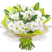 ДЕЛЮКС: хризантема кустовая ромашковая - 15 шт, фрезия/альстромерия белая - 10 шт, альстромерия белая - 14 шт, салал, фетр зеленый, натуральная упаковка.